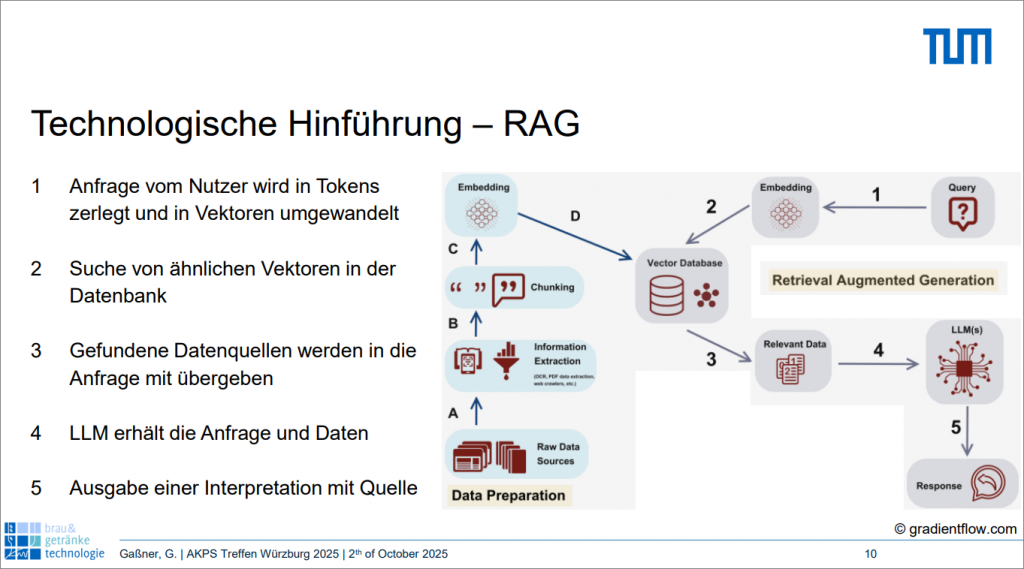 Using the domain of brewing science, it was demonstrated how AI can improve knowledge management in an industrial sector. A dedicated chatbot (ChatBGT) was developed at the Chair of Brewing and Beverage Technology (BGT) at the Technical University of Munich with the goal of generative knowledge preparation. Günther Gaßner provided an introduction to the current state and current challenges in knowledge management. A detailed presentation of generative knowledge processing with the help of AI followed, in which participants were introduced to concepts such as LLM (Large Language Model) or RAG (Retrieval Augmented Generation) and were illustrated through practical application on the chatbot. Possible applications in the brewing sector would then be, for example, process descriptions, recipes, maintenance documentation, machine or laboratory manuals, operating or occupational safety instructions. The use of AI thus helps to secure company knowledge, lay the foundation for future technologies (A2A, SLM, MCP), and ultimately “enable brewers to focus on brewing”.